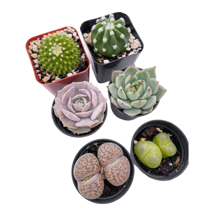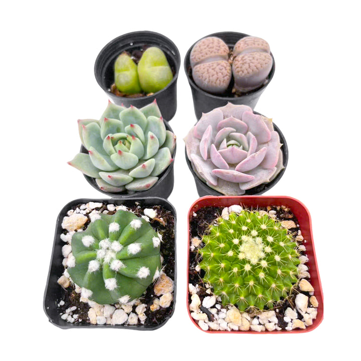 2 Cactus + 2 Lithops + 2 Echeveria Succulents (2", Random Varieties)