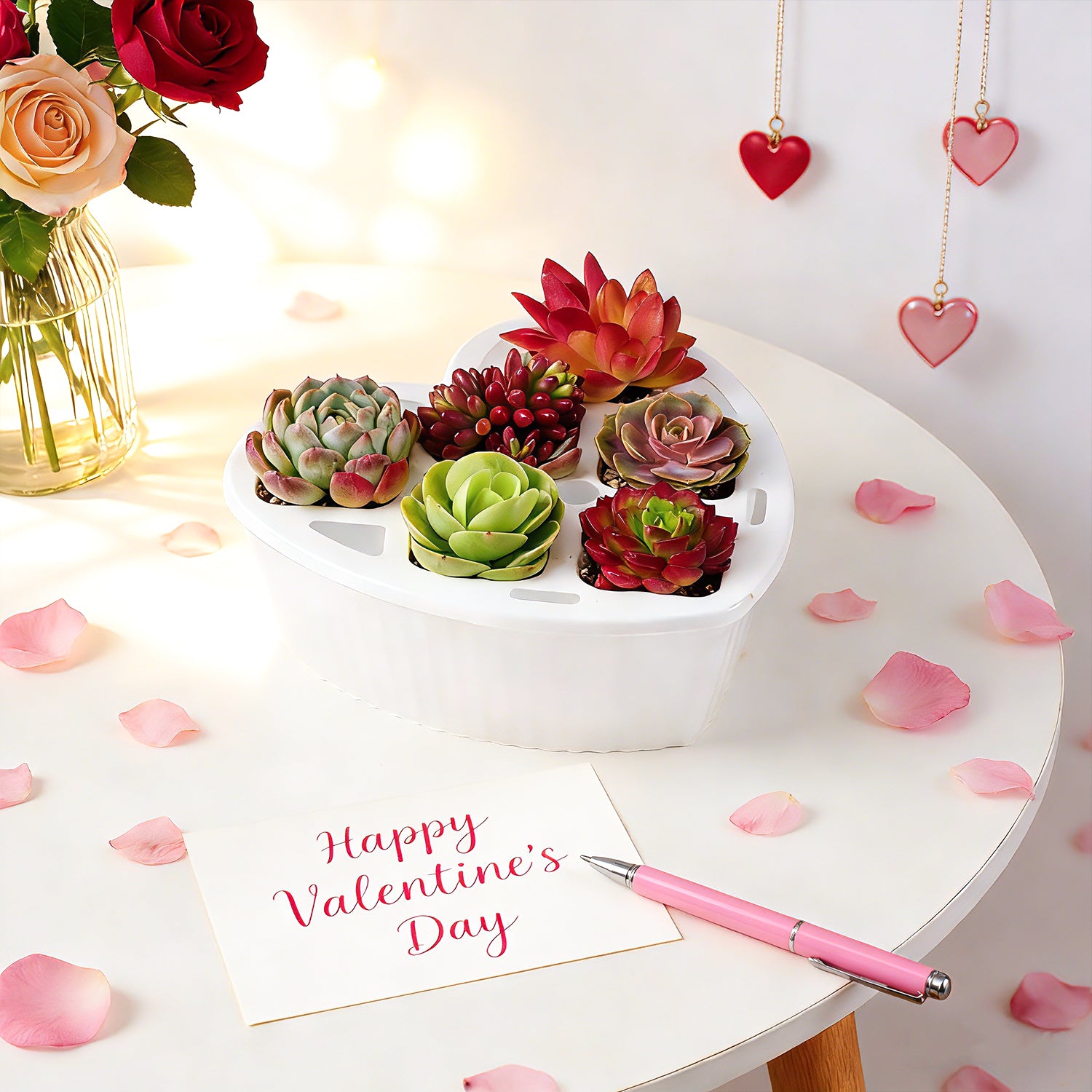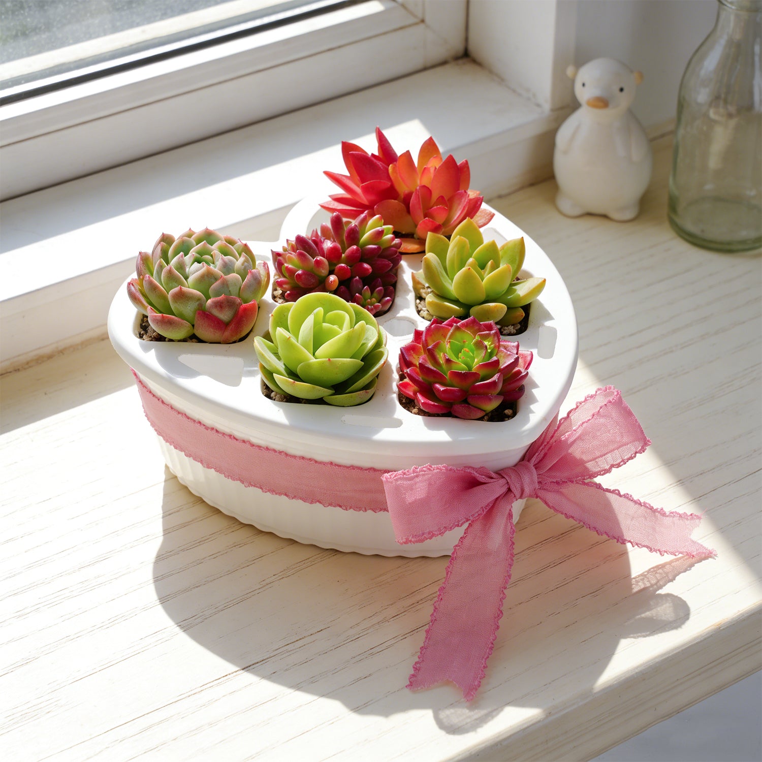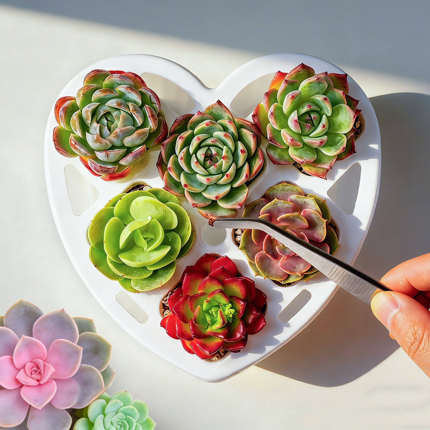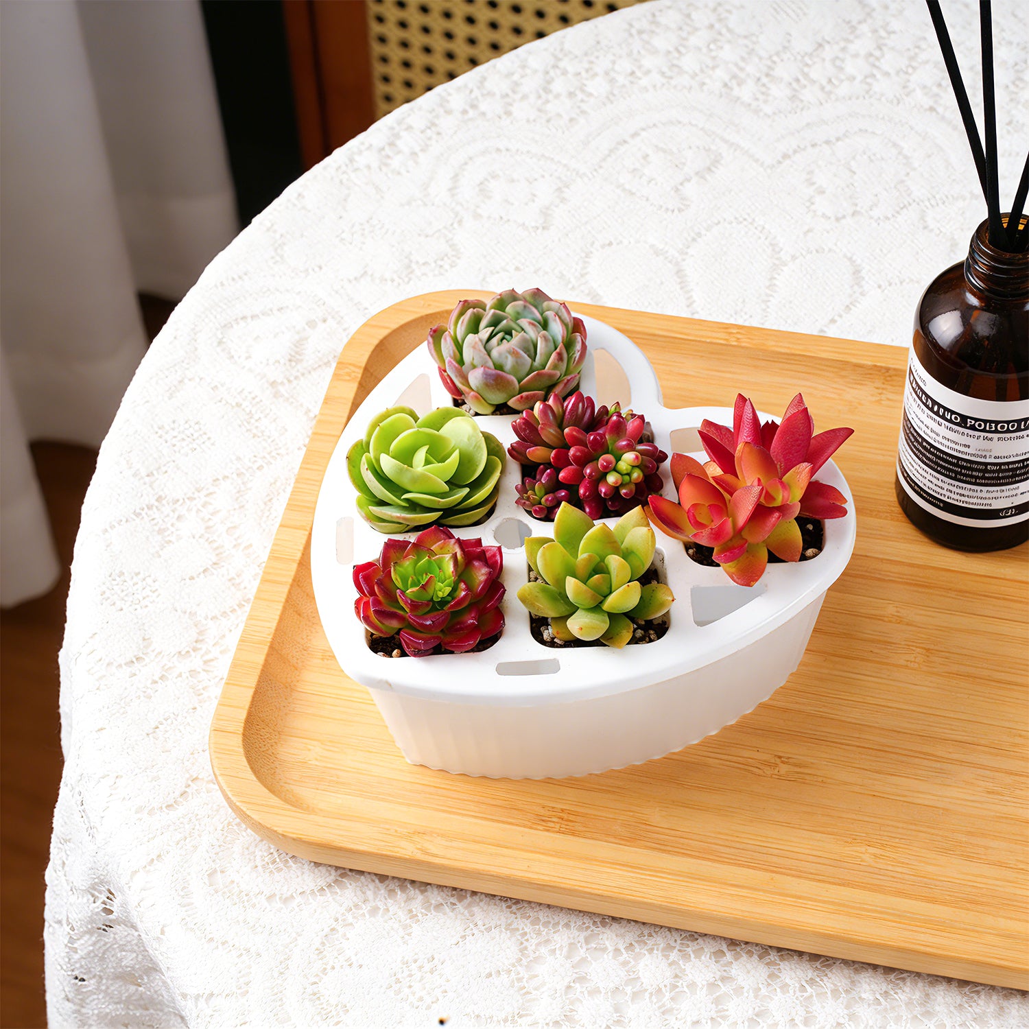 This charming heart-shaped planter set consists of two key pieces: a 6-hole planting tray designed to hold multiple small succulents, and a matching heart-shaped base tray that catches excess water. You have two flexible purchasing options: buy the planter set alone for a DIY gardening project, or opt for the complete kit that includes 6 vibrant succulents (such as Echeveria, Cactus, and Lithops) ready to be potted and displayed instantly.