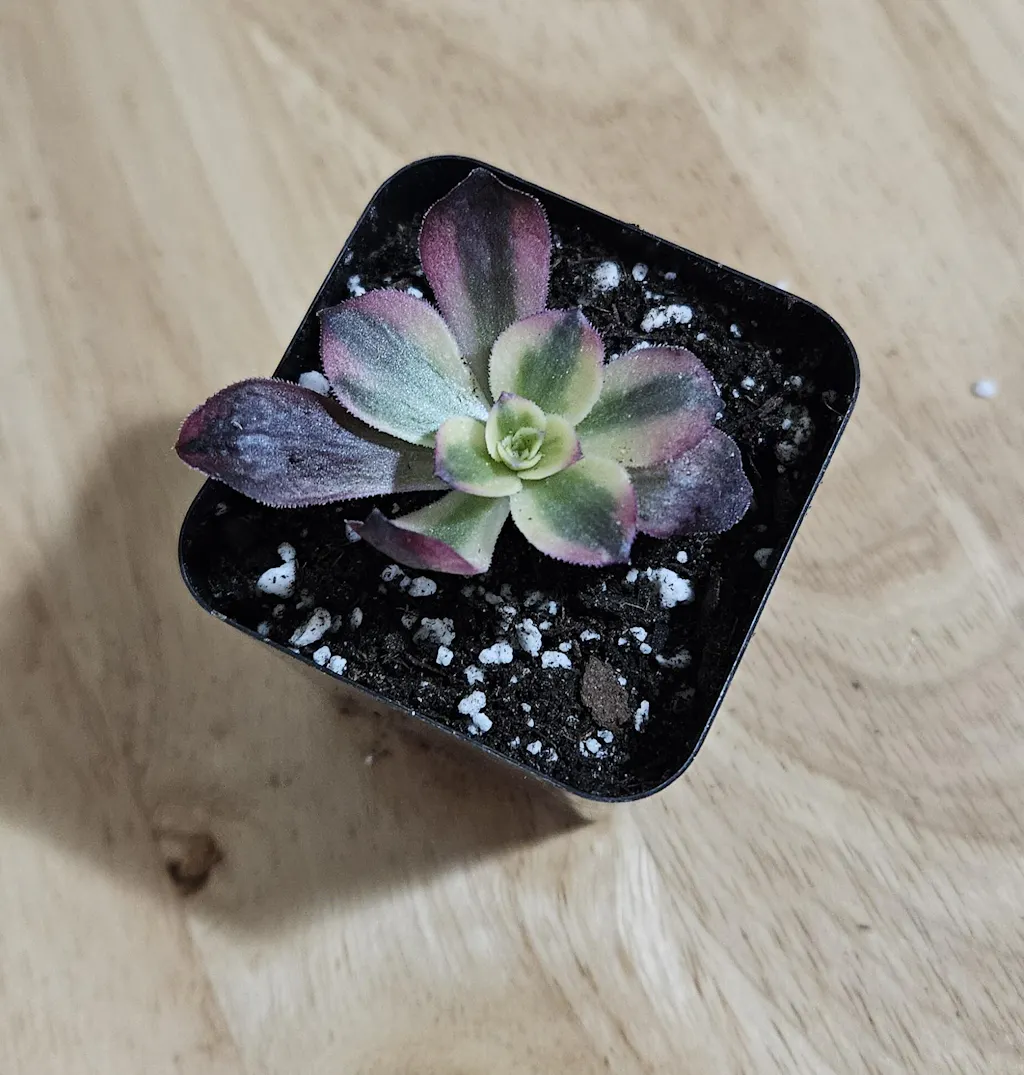 Aeonium 'Medusa' is a succulent plant belonging to the Crassulaceae family, known for its striking visual appeal. Its pink leaves are mixed with black stripes, reminiscent of the Greek mythological succubus Medusa. It is a variegated form of Aeonium 'Velour', featuring offset rosettes formed by variegated spoon-shaped leaves, soft-tipped with slightly fringed edges. It has the capacity to reach a height of up to 18 inches (45 cm) and a width of 16 inches (40 cm), readily producing offsets at a young stage to rapidly develop an appealing cluster. Its color changes throughout the year are truly incredible; transitioning from rich "reds" in the height of summer to milky whites in autumn and winter, with shades nearing pink. Flowering has not been observed to date.