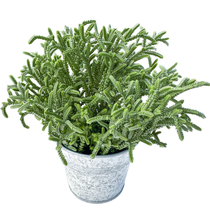 Crassula pyramidalis 'Thumb', commonly called Pagoda Mini Jade, is a fascinating geometric succulent prized for its stacked triangular foliage. This slow-growing variety forms vertical columns of tightly packed, fleshy leaves that resemble miniature pagodas. The jade-green leaves develop red margins when sun-stressed, creating a striking two-tone effect. Mature specimens may produce small white flowers at the stem tips in late winter. Its architectural form and compact size (4-6 inches tall) make it perfect for rock gardens, terrariums, and modern succulent arrangements.