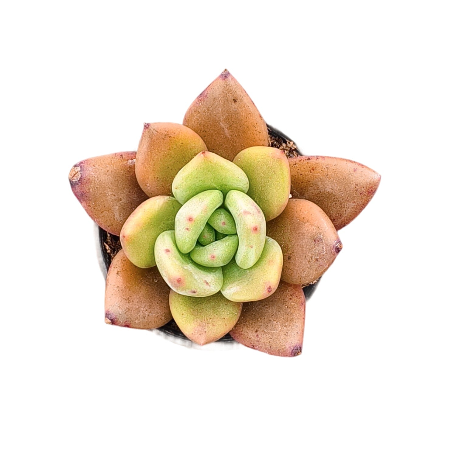 However, when treated to "healthy stress," the 'Baekya' reveals its true, fiery soul. The pale green base transforms into a stunning spectrum of jelly orange, deep orange, and even rich salmon red. A signature trait of this variety is the delicate white farina lines—distinct markings where the leaves were pressed tightly together during growth—giving the plant a "chiseled" or geometric appearance.