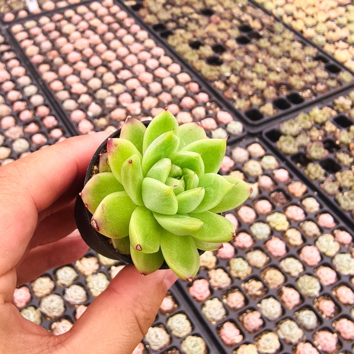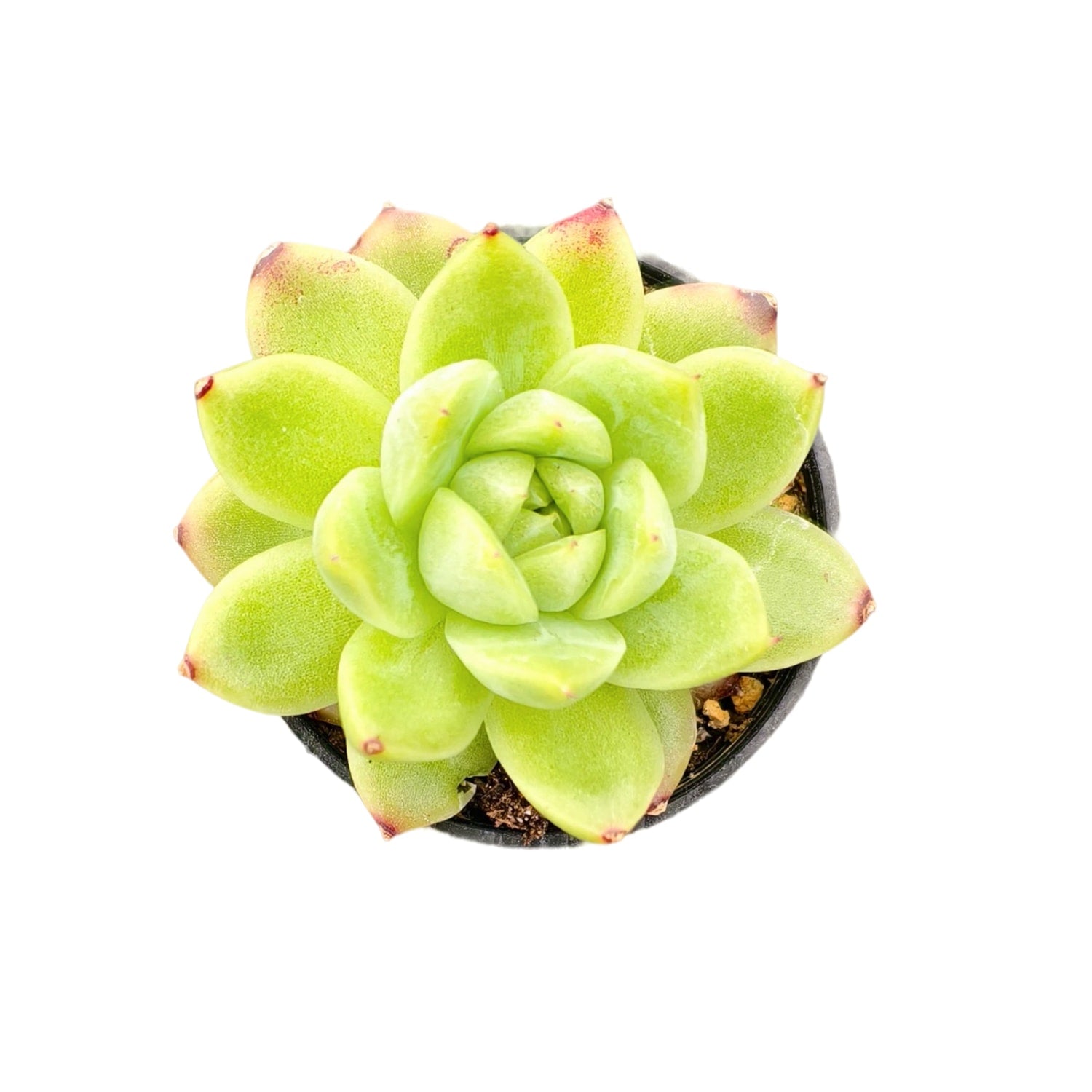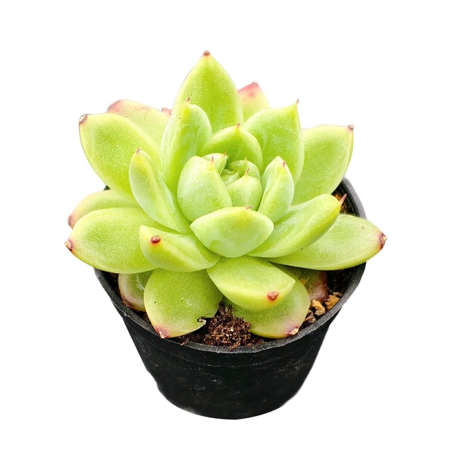 Echeveria 'Blushing Dawn' is a stunning hybrid succulent prized for its symmetrical, lotus-like rosette. Its thick, spoon-shaped leaves feature a bright lime green base, highlighted by delicate pink to reddish margins. As the name suggests, this Echeveria "blushes" with deeper colors when exposed to bright sunlight or cooler temperatures, making it a dynamic centerpiece for any collection.