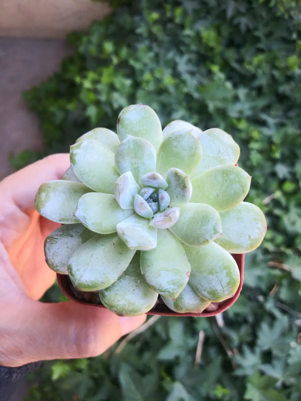 Echeveria Crystal Amber is a very beautiful and attractive succulent whose leaves are covered with a layer of white farina which can protect the leaves from sunburn and form a compact and plump rosette. When it thrives, the leaves will turn pink and light brown.