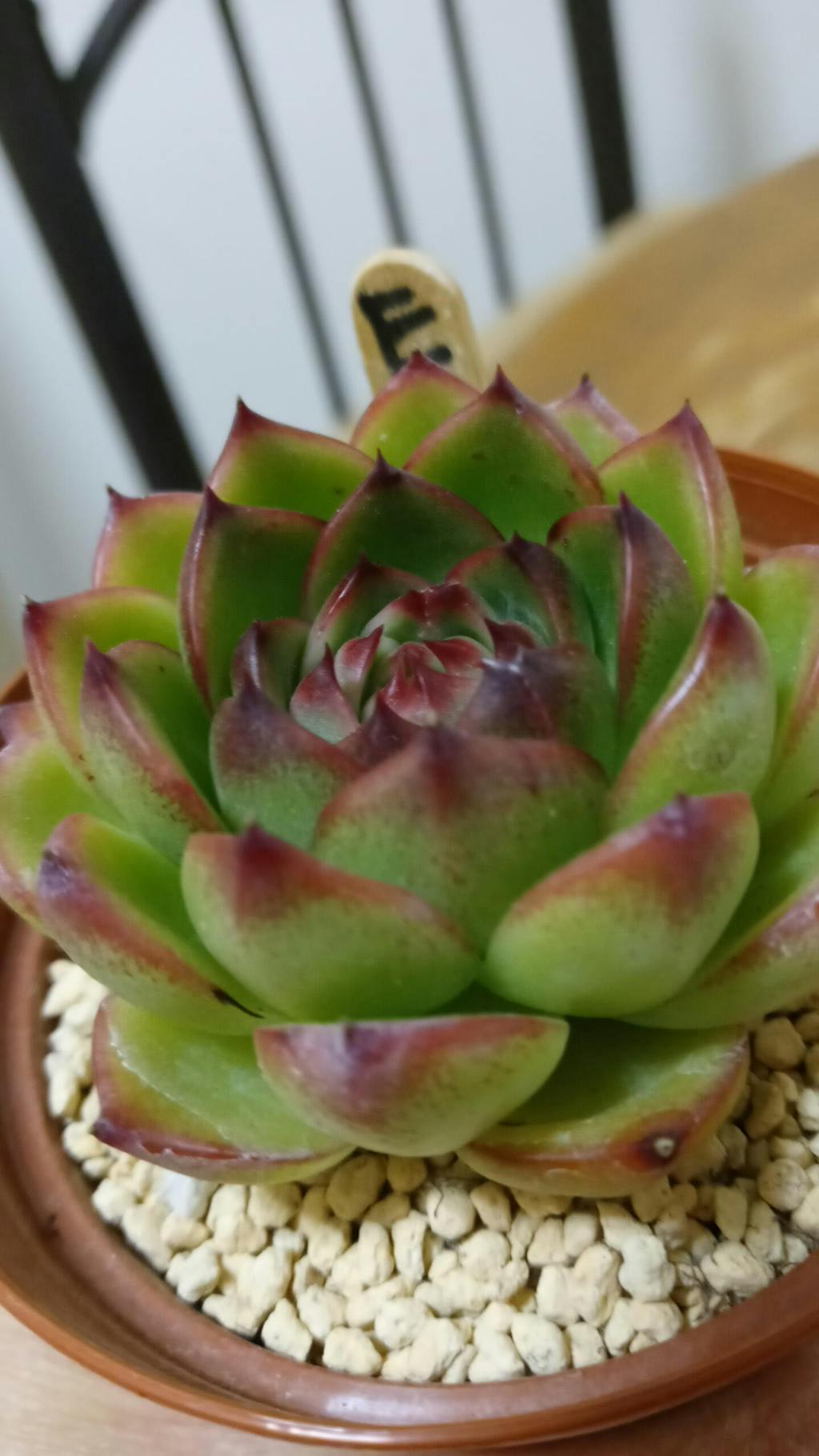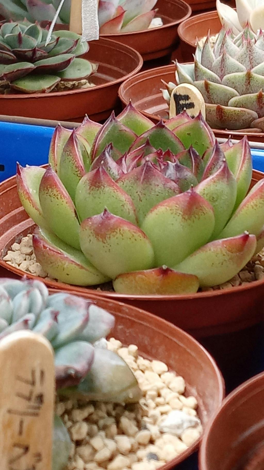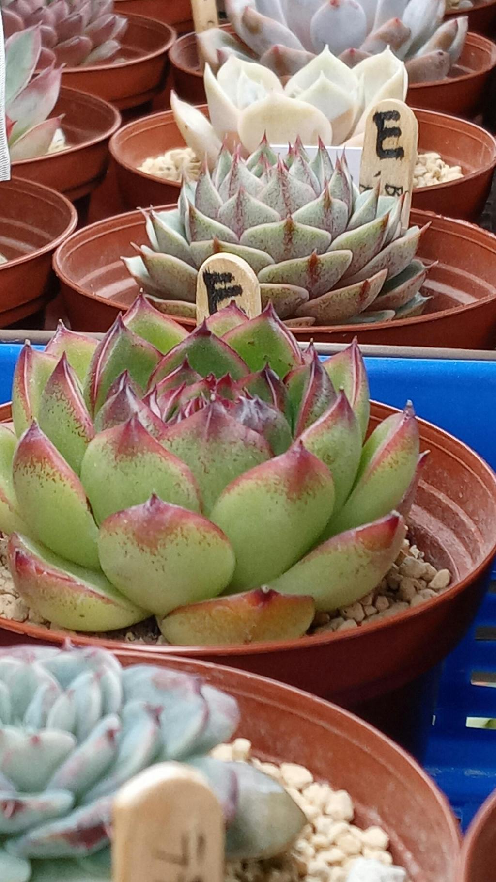 Echeveria 'Moon Stone' features pointy fleshy leaves with dark red color on the tips, with its smaller leaves arranged in a rosette shape. They aren't as vibrant in the summer. In deep fall and winter, the red part on the tips will be wider if they get full daylight.