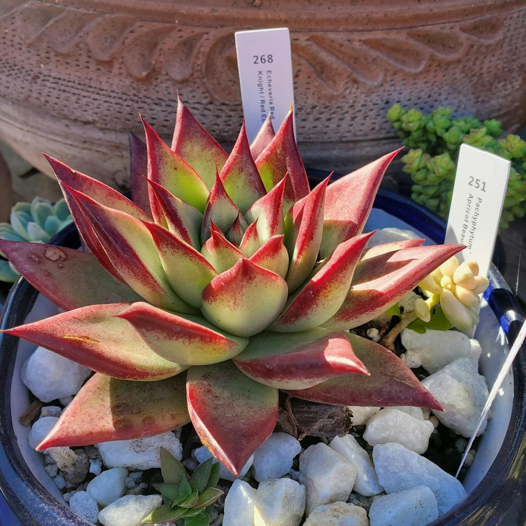 Echeveria Red Knight, also called Red Ebony, was originally found growing in Mexico. It's rosette-shaped, and the leaves are as stiff as a sword, with green color and red edges, typical characteristics of Agavoides. Compared to Echeveri agavoides 'Ebony', the leaves are thicker and there is a larger area of red from the front of the leaves. And you can identify Kakimori Echeveri agavoides 'Ebony' and Echeveria Red Ebony from the colors of their leaves. The former one is yellow and the later one is green. Red Ebony is notoriously slow to offset but easily one of the most beautiful and rewarding Echeverias.