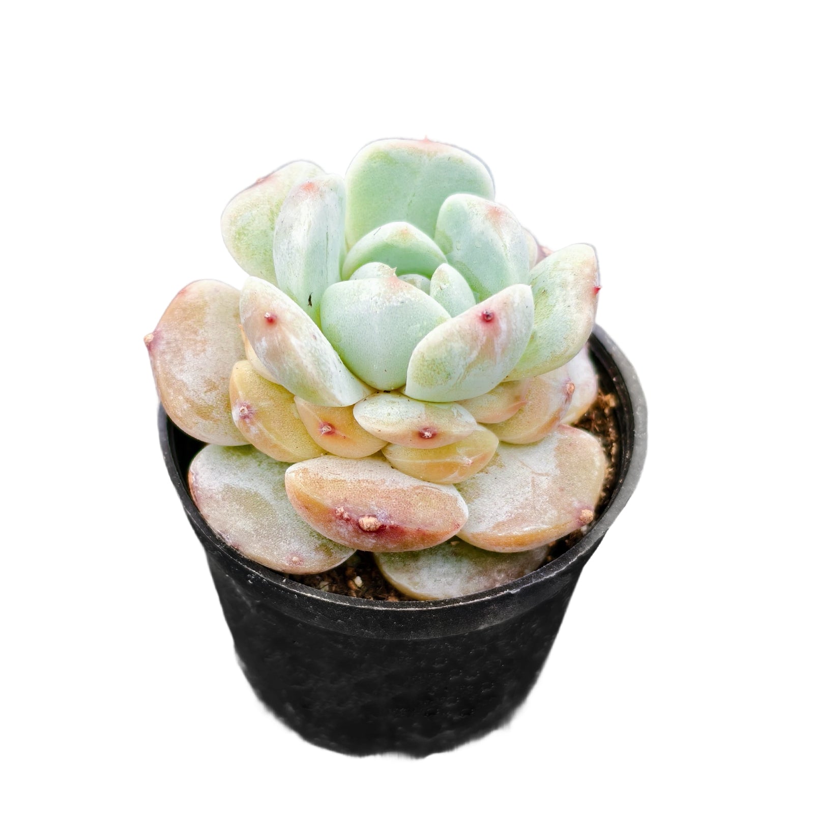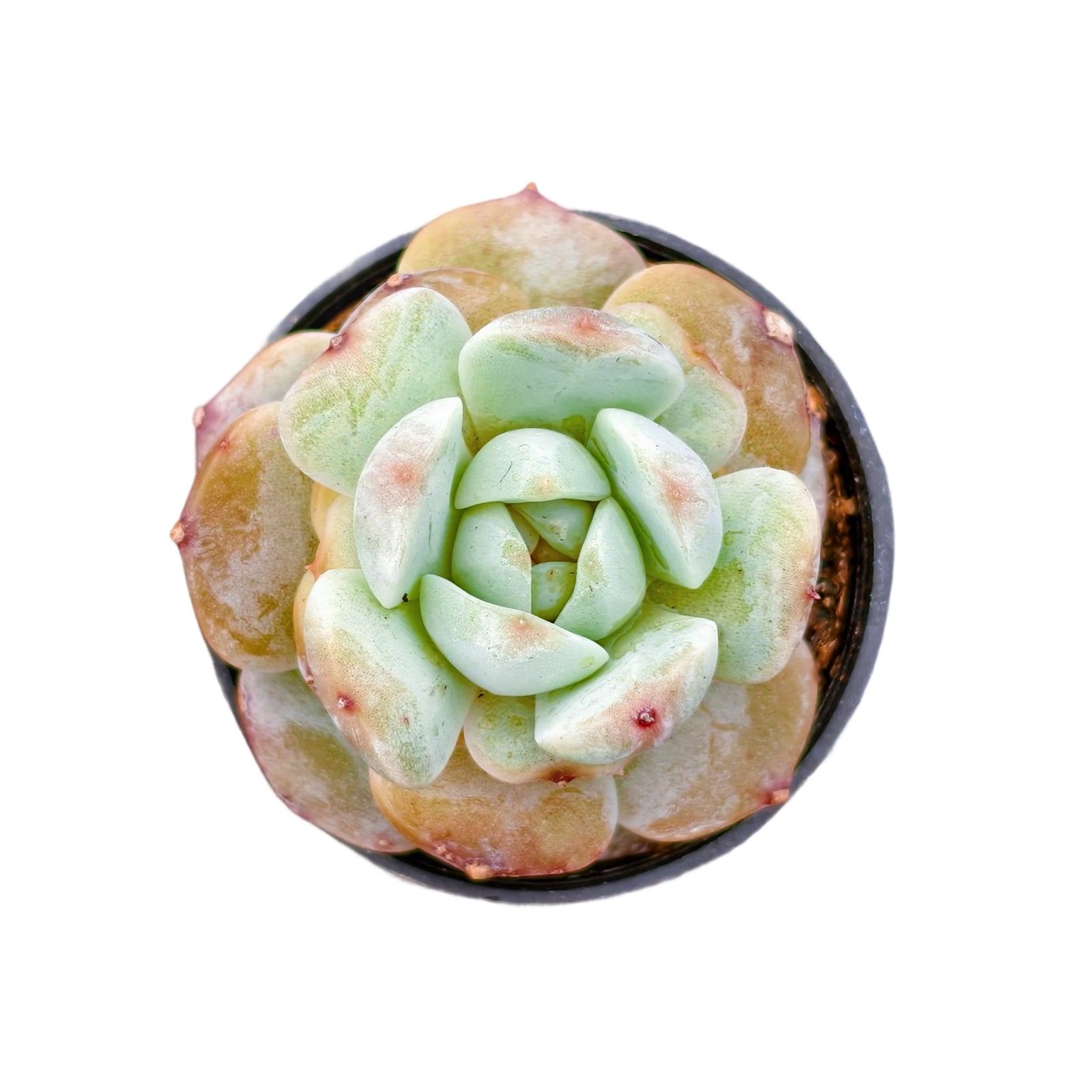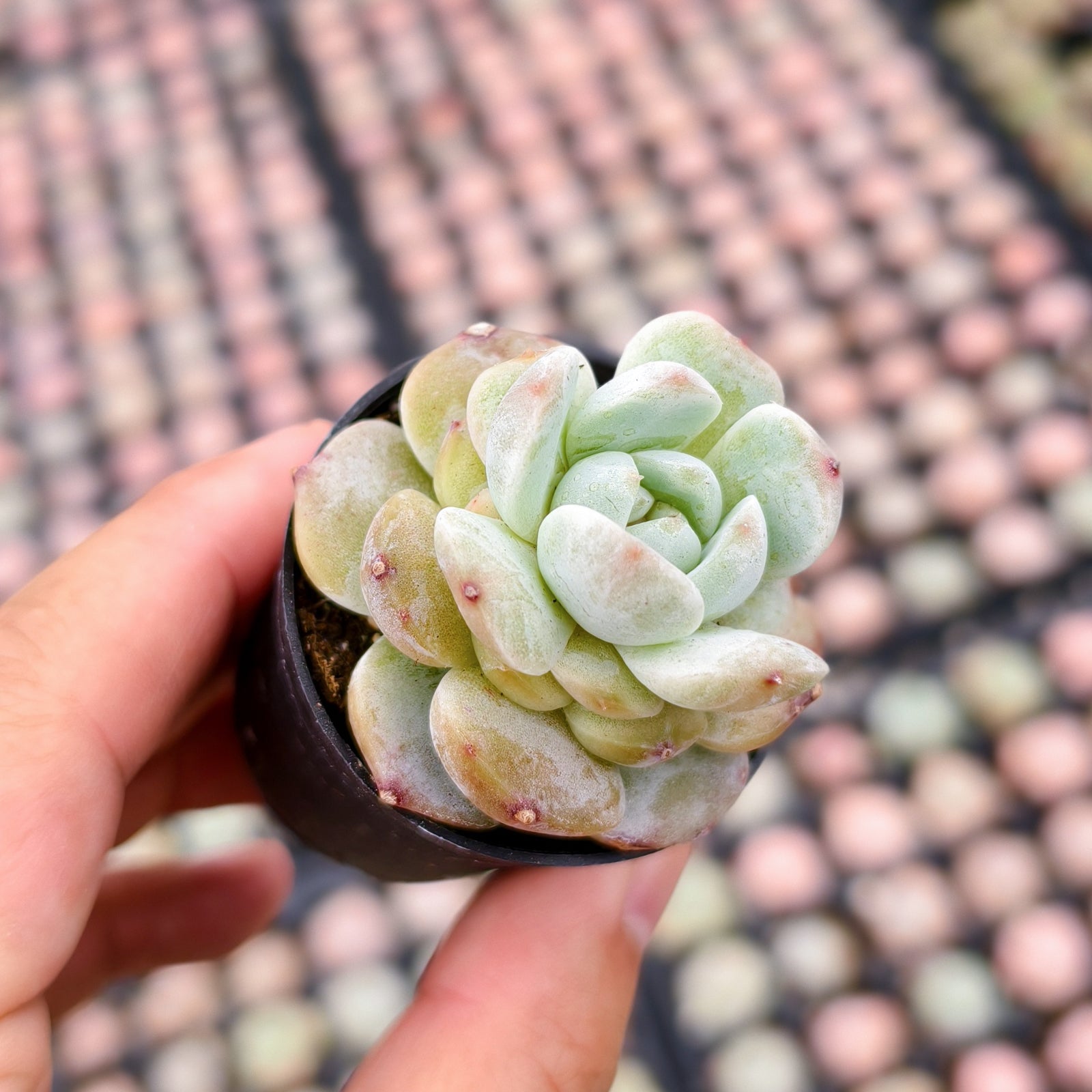 True to its name, Echeveria 'Sweet Honey' features a small, incredibly cute rosette of exceptionally thick, plump leaves. The foliage is finished with a heavy layer of silvery farina, giving it a velvety, "frosted" look. Under bright light or cooler temperatures, the blue-green leaves can take on warm, honey-toned hues or soft pinks. Its compact growth habit and "chubby" texture make it an irresistible addition to any collection.