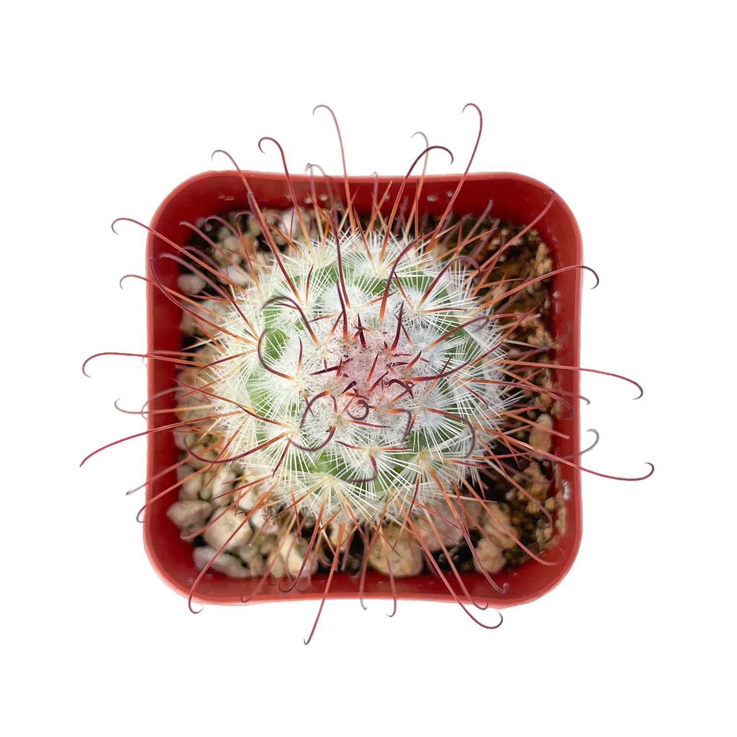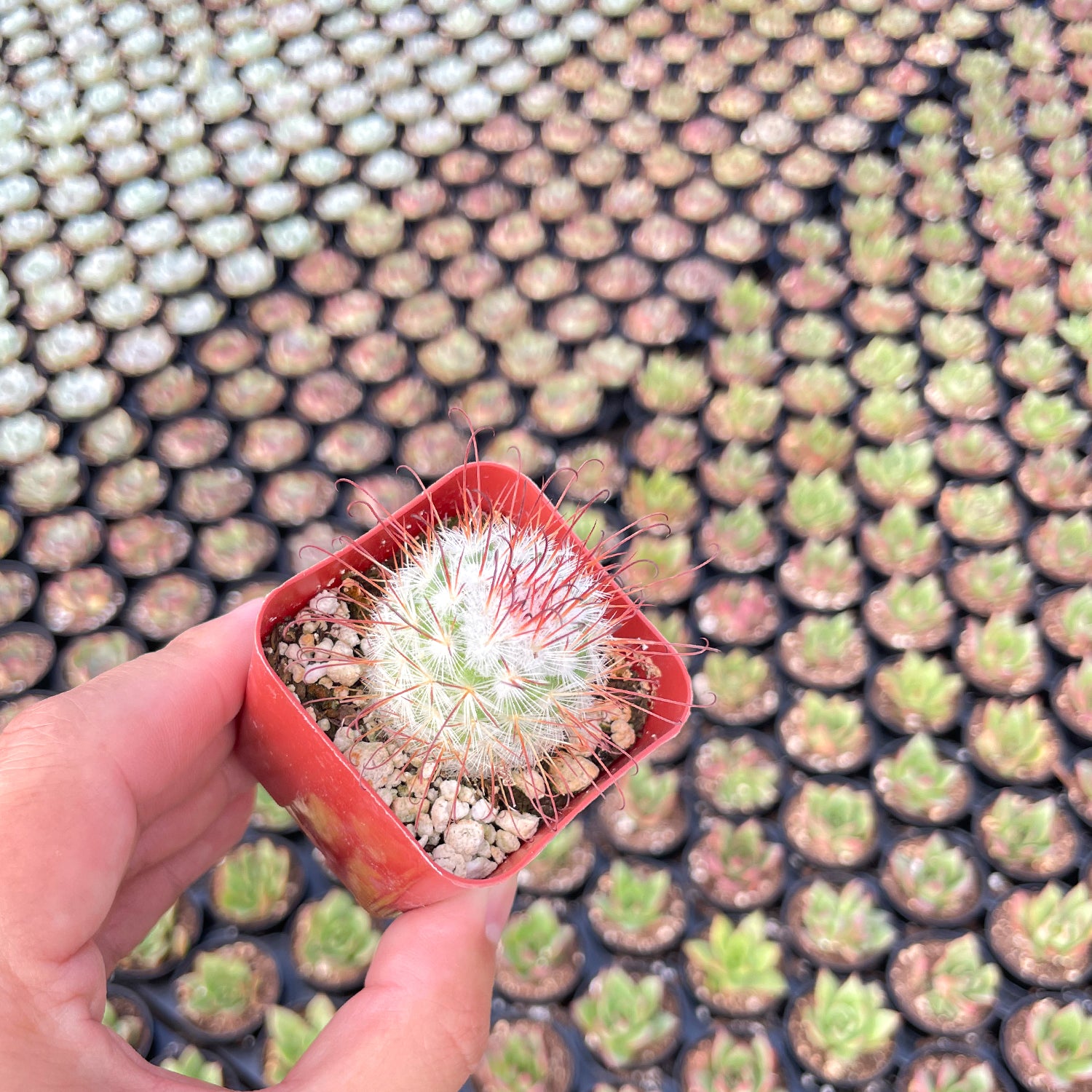 In its 2-inch juvenile stage, this cactus forms small, rounded stems (1–2 inches in diameter) that gradually multiply into dense clumps as it matures. The stems boast a rich, deep green hue, covered in soft, cone-shaped mammillae. From the base of each mammilla emerge clusters of spines: 8–12 slender, white to pale brown radial spines (arranged in a circle) that provide gentle texture, and 1–2 shorter, darker brown central spines (often curved slightly) that add subtle contrast—none of which are overly sharp, making it safe for handling.