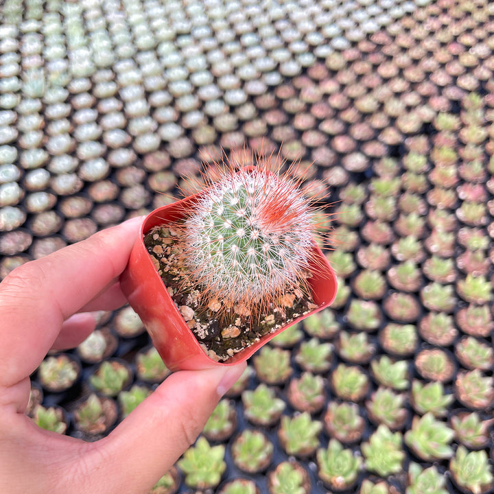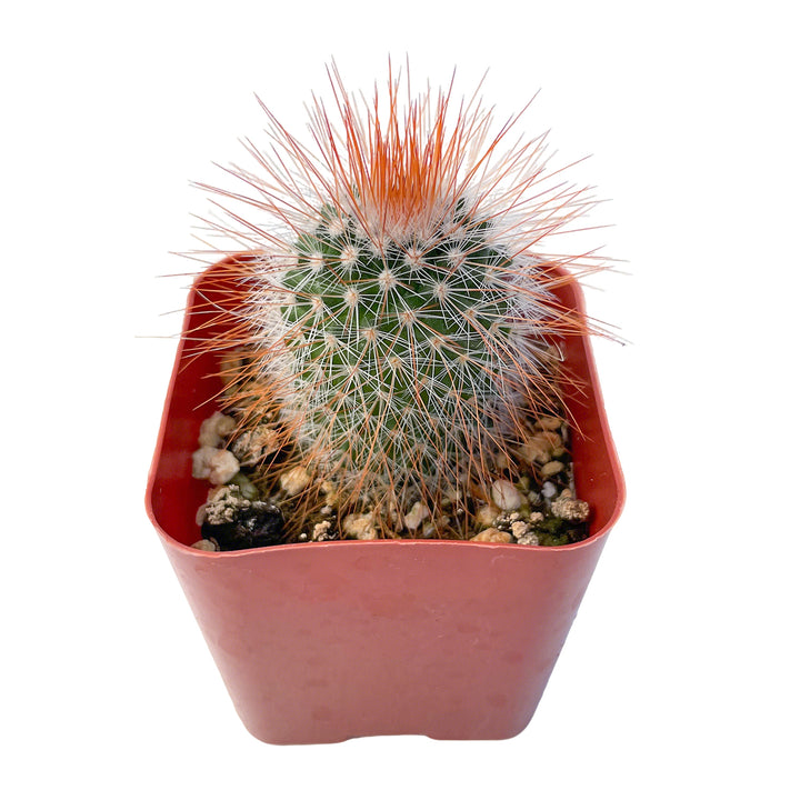 In its 2-inch potted stage, this slow-growing cactus forms a plump, symmetrical globe with a deep green stem covered in distinct, cone-shaped "mammillae" (soft, nipple-like protrusions, a defining trait of the Mammillaria genus). From the base of each mammilla emerge clusters of spines: slender, pale brown radial spines (6–8 per cluster) that provide a delicate frame, and 1–2 thicker, prominent central spines tipped in rich crimson or rust-red—this red hue (echoed in its subspecific epithet "fera-rubra," meaning "wild red") intensifies with sun exposure, adding striking contrast to its green stem. As it matures (over 3–5 years), it may produce small offsets ("pups") around its base, gradually forming a dense clump, though its core globular shape remains compact.