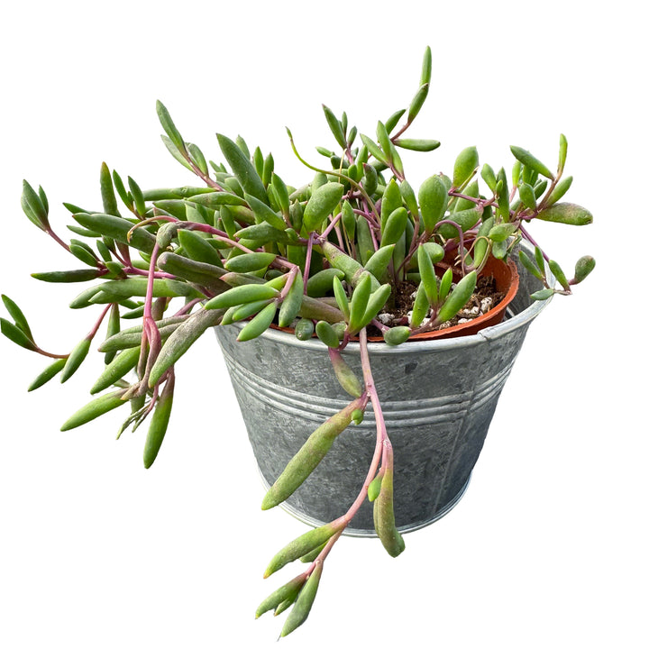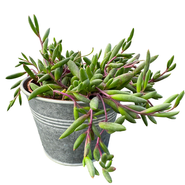 trailing succulent with small green leaves that hang on stems up to 2 feet long. When stressed, the leaves turn purple or burgundy, and the stems turn ruby red to purple. Meanwhile, white tufts of hair come out between stems and leaves, which is exceptionally stunning in hanging baskets or wall gardens. Small, yellow, and daisy-like blooms all year round.