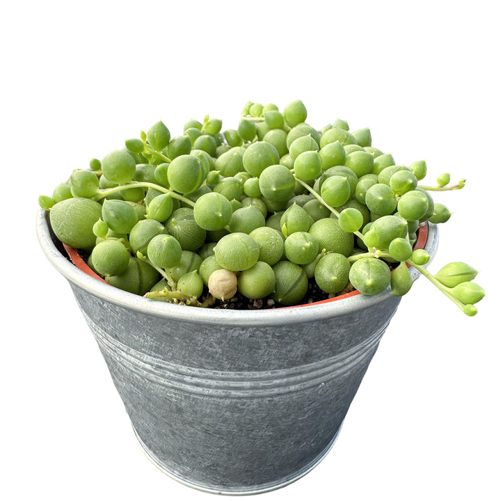 Senecio Rowleyanus, also known as string of pearls/ String of beads, is a popular trailing succulent for its pendant stems, with pearl-like leaves. A fast grower which is easy to propagate from stems cuttings. Small white blooms in cooler months of the year.