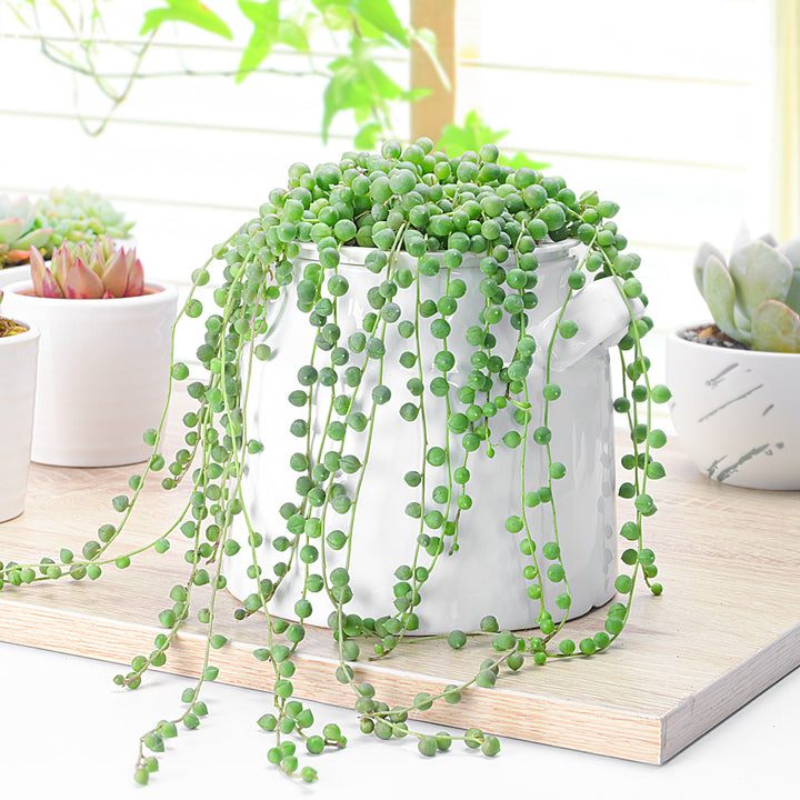 Sun/Location: Like other soft succulents, String of pearls requires indirect bright sunlight to thrive. It can be placed outdoors in spring and fall to get full sunlight. Shade is required in summer to avoid sunburn. In winter, protection from frost is needed. The unique bead-like foliage makes String of Pearls an excellent choice as a trailing houseplant by a south-facing window.